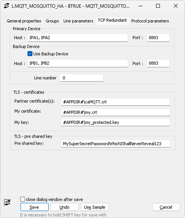 By the way, the D2000 KOM can also try multiple IP addresses or symbolic names. They can be entered in the TCP/IP-TCP or TCP/IP-TCP Redundant line configuration in the Host field, separated by a comma or semicolon. So, if we have two redundant MQTT brokers that are together with D2000 Servers on two redundant networks, then each of the MQTT brokers has two IP addresses that can be entered in the Host field. At any time, two TCP connections can be open, each of them to one of the two IP addresses of the redundant MQTT brokers.